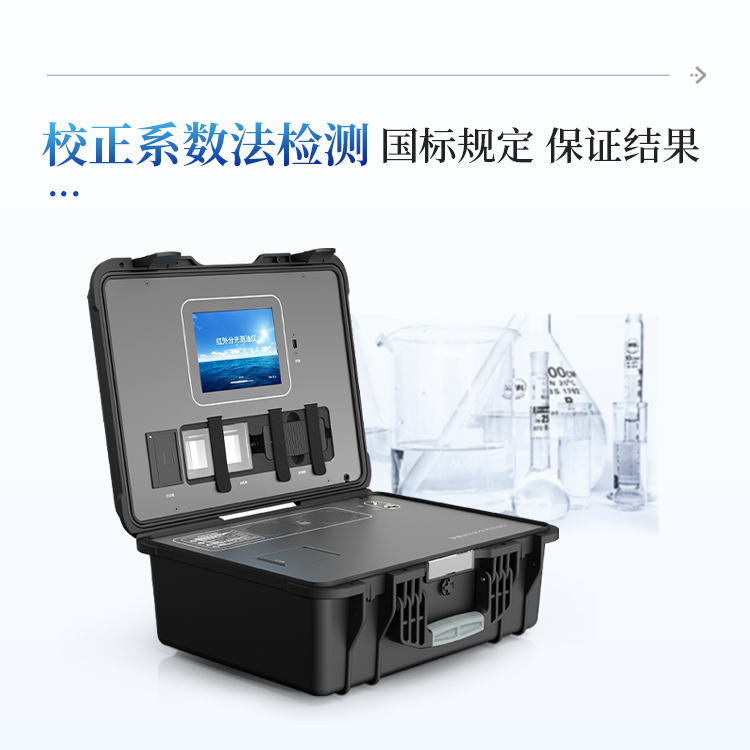 1)本产品采用了国标规定的校正系数法检测原理,严格按照国标标准公式,使用20mg/L正十六烷,20mg/L异辛烷,100mg/L苯进行校准,最终带入校准公式算出仪器校正系数进行测量样品(也可以使用标准曲线法进行检测);